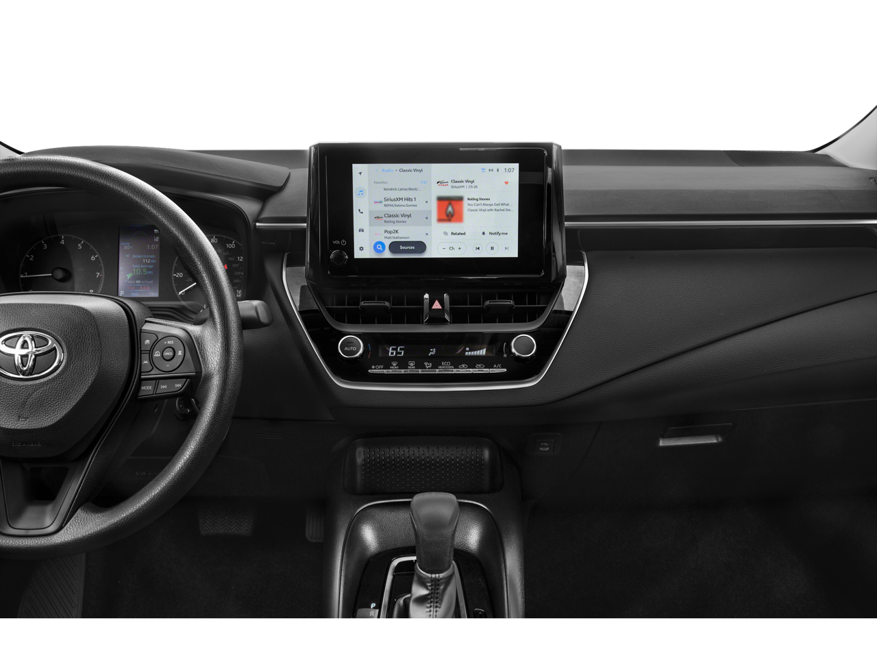 2025 Toyota Corolla 6 Speakers, Air Conditioning, AM/FM radio: SiriusXM, Automatic temperature control, Power steering, Power windows, Radio data system, Radio: 8" Toyota Audio Multimedia, Rear window defroster, Remote keyless entry, Steering wheel mounted audio controls, 4-Wheel Disc Brakes, ABS brakes, Apple CarPlay/Android Auto, Auto High-beam Headlights, Brake assist, Bumpers: body-color, Delay-off headlights, Driver door bin, Driver vanity mirror, Dual front impact airbags, Dual front side impact airbags, Electronic Stability Control, Emergency communication system: Safety Connect (up to 10-year trial subscription), Exterior Parking Camera Rear, Fabric Seat Trim, Front anti-roll bar, Front Bucket Seats, Front Center Armrest, Front reading lights, Front wheel independent suspension, Fully automatic headlights, Illuminated entry, Knee airbag, Low tire pressure warning, Occupant sensing airbag, Outside temperature display, Overhead airbag, Panic alarm, Passenger door bin, Passenger vanity mirror, Power door mirrors, Rear anti-roll bar, Rear seat center armrest, Rear side impact airbag, Speed control, Split folding rear seat, Tachometer, Telescoping steering wheel, Tilt steering wheel, Traction control, Trip computer, and Wheels: 16" Steel with Covers.